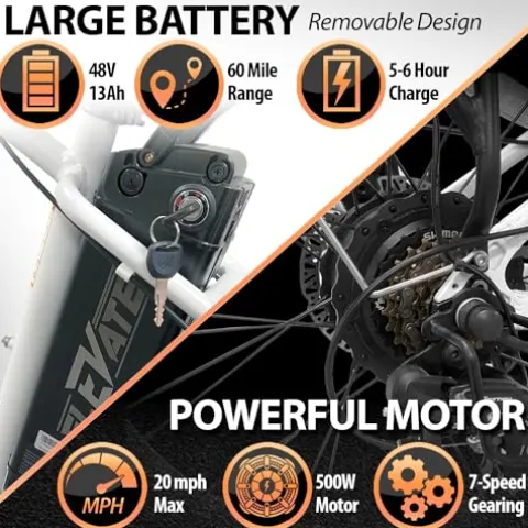- ✅ POWERFUL MOTOR & LONG-RANGE BATTERY – With a brushless 48V motor and 11.6Ah Lithium-Ion battery, the Cabo allows riders to travel up to 60 miles per charge using pedal assist and up to 25 miles by throttle only. The 500W (750W peak) rear-drive motor provides reliable support and 20mph top speed.