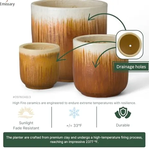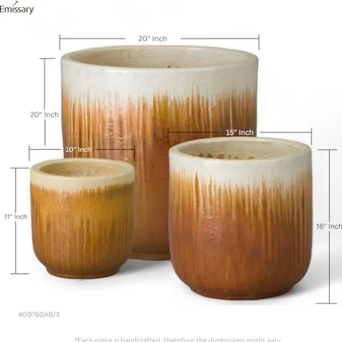 The Emissary 20in. L x 20in. H Amber Stoneware Round Planters set elevates your gardening aesthetics with their exquisite craftsmanship and warm amber hue. Handcrafted from high-quality stoneware, these planters are designed for durability while also embracing eco-friendly practices that utilize local resources. The glossy glaze finish not only adds a touch of sophistication to both indoor and outdoor spaces but also ensures easy maintenance. Equipped with drainage holes, these planters promote healthy plant growth by preventing water build-up and root rot, making them an ideal choice for both novice and experienced gardeners. Enhance your home or garden with this elegant set of three planters, perfect for showcasing your favorite plants.