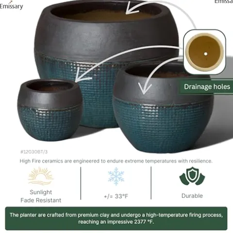 The Emissary 22-inch L x 17.5-inch H Matte Black/Teal Stoneware Round Planters (Set of 3) effortlessly combines style and functionality, making them an ideal addition to any indoor or outdoor space. Handcrafted with high-quality stoneware, these durable planters feature an eco-friendly design that utilizes local resources, significantly reducing your carbon footprint. The striking matte black and teal color scheme, complemented by a semiglossy glaze finish, adds a touch of sophistication to your decor. Equipped with drainage holes, these planters promote healthy plant growth by preventing water build-up and root rot, ensuring your greenery thrives beautifully.