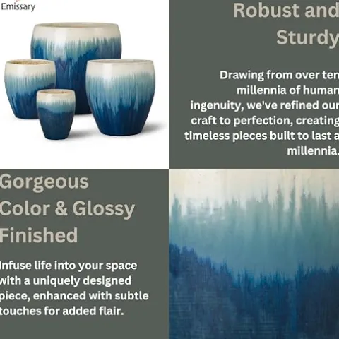 The Emissary Blue Snow Stoneware Round Planters set, featuring four sizes (13in., 16in., 19in., and 23.5in. H), combines exquisite craftsmanship with eco-friendly design to elevate any space. Handcrafted from durable stoneware, these planters showcase a stunning glossy glaze finish in a cool Blue Snow hue, adding a touch of sophistication to both indoor and outdoor settings. Each planter is thoughtfully designed with drainage holes, ensuring optimal plant health by preventing water build-up and root rot. Perfect for showcasing your favorite plants while enhancing the aesthetic of your home or garden, this set is a stylish and sustainable choice for any plant enthusiast.