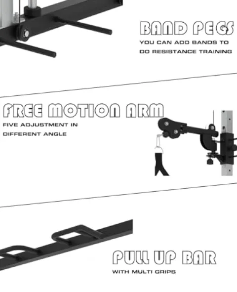 - EONFITOmni smith machine home gym base units start with EONFITOmni power rack cable machine. It comes a smith bar and 4 pairs lock pins. The unique design lock pins are compatible with our cable attachment and easy to be attached, detached or adjusted on the uprights to suit any purpose of exercises. what’s more, it’s a great versatile power cage with squat rack, cable crossover machine, lat pulldown system, functional trainer, chin-up, and landmine core trainer.