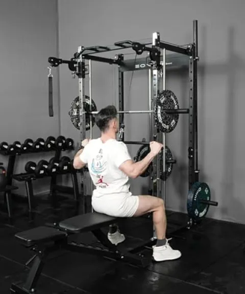 - E3 smithmachine with Unique Design — we add 2 adjustable articulating arms on the uprights pulley system which extend the width so you could perform better in cable crossover chest fly. And you could do lat pulldown, seated row, bicep, tricep, shoulder, arm, chest and back mucles trianing through height adjustment.