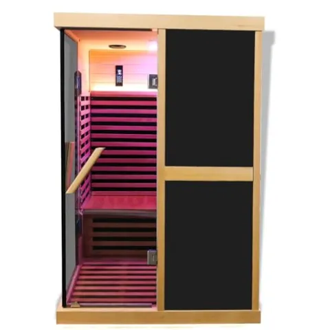 - 🔥 𝐏𝐫𝐞𝐦𝐢𝐮𝐦 𝐖𝐨𝐨𝐝 𝐁𝐮𝐢𝐥𝐝: Crafted from lightweight and durable Canadian Hemlock, Our 2-person infrared saunas is resistant to deformation and cracking, and able to withstand all kinds of climatic conditions, ensuring a long time of use. It offers excellent insulation properties, effectively retaining heat within the sauna room. The home sauna is suitable for both indoor and outdoor use