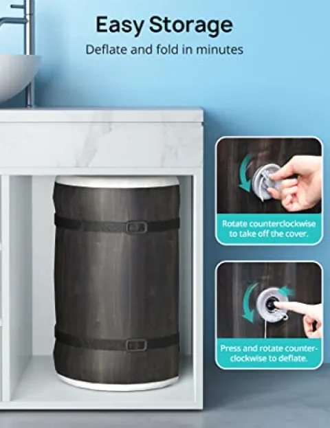 - 4-Step Installation: Enjoy easy installation of the inflatable hot tub via 4 simple steps, enabling you to enjoy relaxing bathing without the long wait time. Simply turn the pump counterclockwise to deflate quickly and thoroughly, and the tub can be fully folded into a smaller volume for storage.
