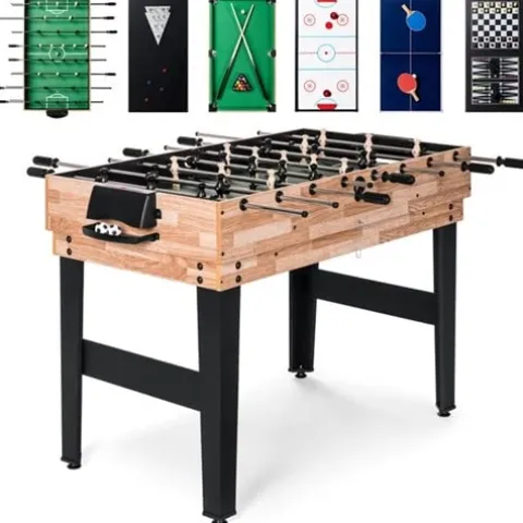 Enhance your game room with the Fast Furnishings 10-in-1 Combo Game Room Table Set in Brown. This versatile set includes pool, foosball, ping pong, and chess, offering endless entertainment options for family and friends. With assembly required, this all-in-one game table is perfect for creating a fun and interactive space in your home.