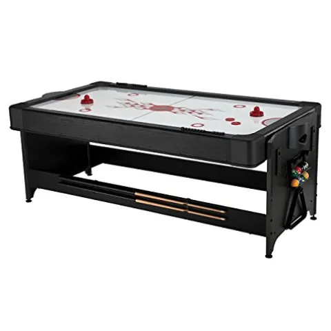 - Includes all of the accessories needed to play the games you love such as pool cues and billiard balls, hockey pucks and pushers, and table tennis paddles and net