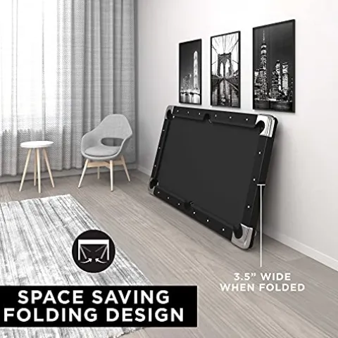 - Pool table dimensions – 76” L x 43” W x 32” H | Weight – 114 lbs. | Balls (each) – 2.25” Diameter | Cues (each) – 57” | Playing table thickness – ½” | Indoor only