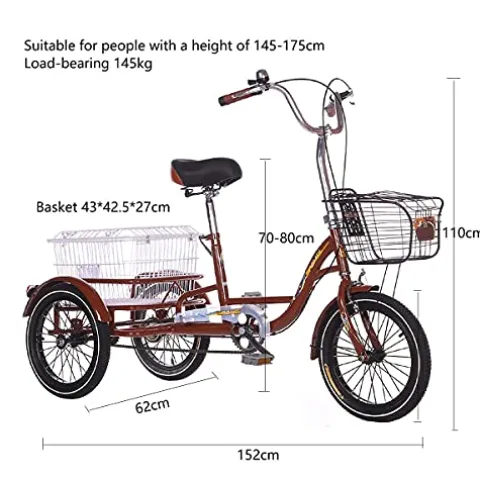 - SIZE: 16 inch Single Speed 3 wheel bike, length 152cm, width 62cm, height 110cm, Suitable for height 145-175cm, Load bearing 145kg, Adjustable seat height.