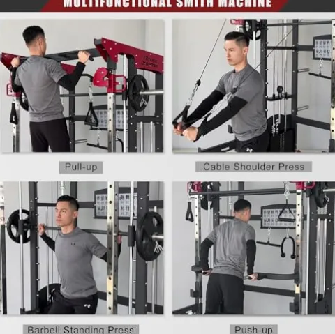 - Versatile All-In-One Smith Machine: This comprehensive home gym system combines a smith machine, pull-up station, and cable crossover machine for a full-body workout. Improve your exercise efficiency by avoiding the commute and fees associated with a gym membership. The machine features 18 adjustable heights, perfect for a variety of exercises like cable crossover flies and lat pull-downs.