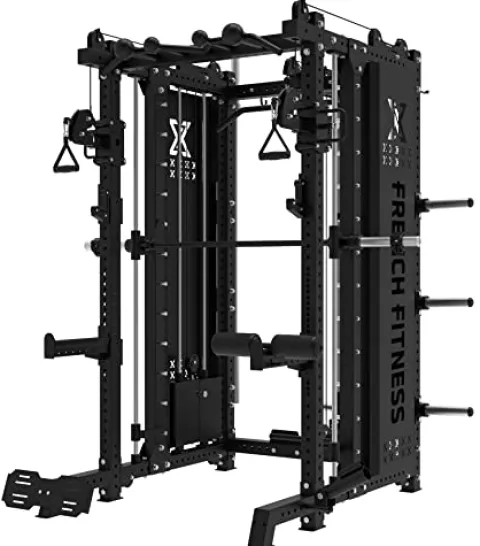 The French Fitness FSR100 Commercial Functional Smith Rack System is a comprehensive all-in-one home gym solution for those seeking a versatile and multifunctional workout experience. This innovative smith machine offers a wide range of exercises, including pull-ups, squats, and more, all within a durable 11 gauge steel construction for long-lasting durability. With optional attachments like a lat pulldown, leg press, and dip handle, this gym system allows for a truly customizable workout experience tailored to your fitness goals. Elevate your home fitness routine with the French Fitness FSR100 and enjoy a full-body workout from the comfort of your own home.