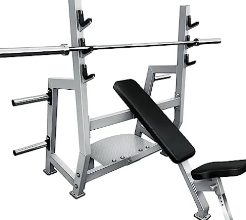 The French Fitness Napa Olympic Incline Bench with Weight Storage combines quality construction with versatile features for a robust workout experience. This silver bench boasts a durable 11-gauge steel frame with TIG welding and PU leather upholstery. Designed for stability and comfort, it includes an adjustable seat with eight positions, a 30-degree incline, and a diamond-plated spotter platform. The bench also features three catch bars and a rear extension with four built-in weight horns for convenient storage. With a maximum load capacity ranging from 661.3 lbs to 1102.3 lbs, this commercial-grade bench is suitable for heavy lifting routines. Backed by a 10-year parts warranty and weighing 202.8 lbs, this bench is a reliable addition to any home or commercial gym.