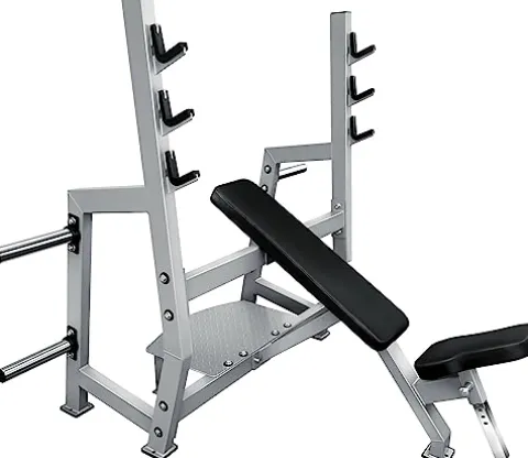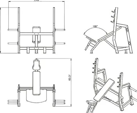 - Electrostatic powder coating; Diamond-plated, non-skid spotter platform; 30-degree incline; Three (3) catch bar; Eight (8) seat adjustments; Rear extension with built-in four (4) weight horns.