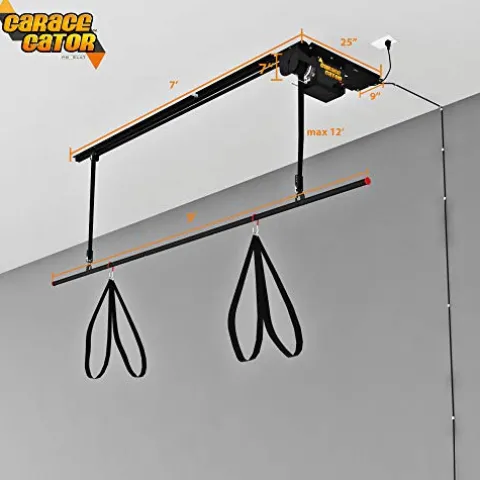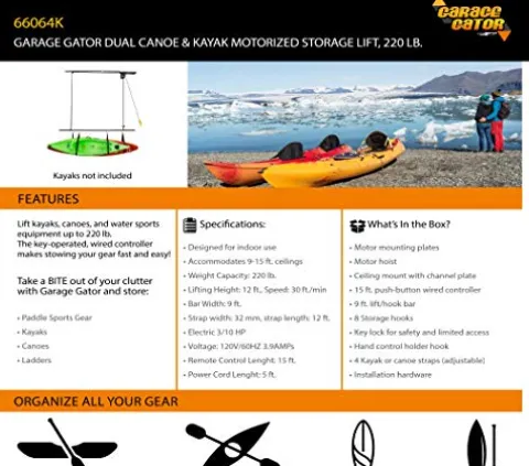 Effortlessly lower, lift, and securely store your kayaks, canoes, and other recreational gear with the Garage Gator 66064K Dual Kayak and Canoe Lift in sleek black. This innovative storage solution is perfect for minimizing effort when loading your boat onto your car or trailer. The set includes motor mounting plates, motor hoist, ceiling mount with channel plate, 16 ft. push-button wired controller, 9 ft. lift/hook bar, 8 storage hooks, key lock for safety, limited access hand control holder hook, and 4 adjustable kayak or canoe strap kits, along with installation hardware. Ideal for keeping your gear organized and easily accessible, this Garage Gator lift is a must-have for any outdoor enthusiast.