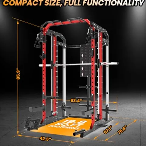 Elevate your home fitness experience with the GarveeLife Power Cage Smith Machine, a robust all-in-one power rack that supports up to 2400 lbs. This dynamic gym equipment, available in a striking red finish, combines a power rack, cable crossover, and lat pulldown system to offer endless training possibilities. Its dual pulley systems allow for shared workouts, while essential attachments like Dip bars, Tricep Rope, and Ankle Strap come included, eliminating the need for additional purchases. Constructed with premium 2″ x 2″ powder-coated uprights, this power cage is built to withstand the most intense workout sessions. Maximize your space with its compact design and generous 67″ walk-in area, making it easy to incorporate into any home gym. Enjoy a hassle-free setup with detailed assembly instructions, allowing you to swiftly focus on your fitness journey.
