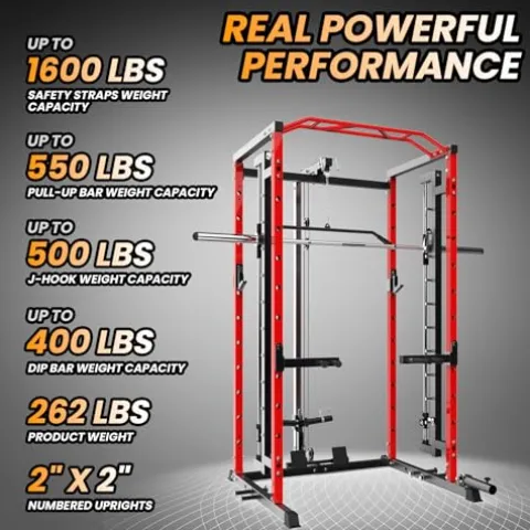 Elevate your home gym with the GarveeLife Power Cage with SmithBar, a premium power rack designed to support up to 1600 lbs for a gym-quality workout experience. Featuring a vibrant red finish, this versatile equipment offers endless training possibilities—from squats and bench presses to pull-ups and dips—ensuring a comprehensive strength training routine. Its fully equipped design comes with 21 free attachments, including a SmithBar and nylon safety straps, making it ideal for both beginners and seasoned athletes. Crafted with durable 2″ x 2″ steel uprights and a compact footprint of just 12.1 square feet, it provides ample space for a variety of exercises without overwhelming your home. Easy to install with thorough instructions and exceptional customer support, the GarveeLife Power Cage offers a seamless blend of functionality, safety, and space efficiency.