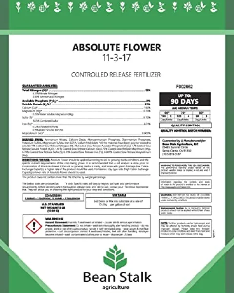 Bean Stalk Absolute Flower Controlled Release Fertilizer is designed to nourish your plants with precision and care, promoting vibrant blooms and healthy growth. This 50 lb pail features a specialized formula that releases nutrients gradually, ensuring consistent feeding over time without the risk of over-fertilization. Ideal for flowering plants, this fertilizer supports robust root development and enhances overall plant vitality. With its user-friendly application and effective results, it’s the perfect solution for both novice gardeners and seasoned horticulturists looking to achieve stunning floral displays. Elevate your gardening experience with the reliable performance of Bean Stalk Absolute Flower.
