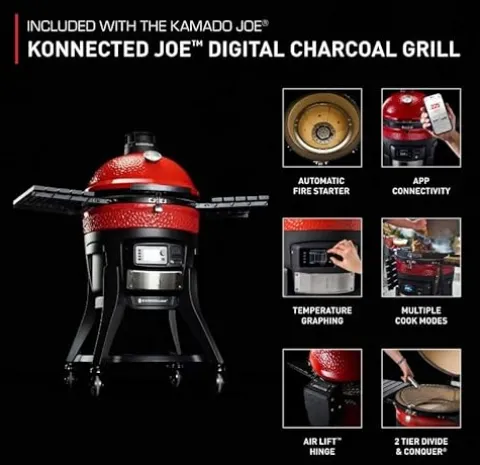 The Kamado Joe Konnected Joe Digital Charcoal Grill and Smoker combines advanced technology with classic grilling for an exceptional outdoor cooking experience. This 18-inch WiFi ceramic grill offers 250 sq. in. of cooking space, perfect for gatherings of any size. The Automatic Fire Starter (AFS) button allows for quick ignition of charcoal, while the Digital Kontrol Board provides real-time temperature monitoring, alerts, and multiple cooking modes to ensure perfectly cooked meals every time. Designed for ease of use, the Air Lift Hinge reduces the weight of the dome, making it effortless to open and close, and the Kontrol Tower top vent maintains consistent airflow for precise temperature control. Elevate your grilling game with this innovative and stylish red grill, engineered for both beginners and seasoned chefs alike.