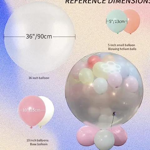 - Package Includes: transparent 36-inch large balloons *14; 7 inch base balloons (white and pink) *200; Colored 5-inch balloons (white and macaron mix) *1000; Electric balloon machine *1; 1 controller 8 controller *1 (can be reusable); A set of ball expander; Balloon divider *1; *1 piece of Scotch tape; Tape measure *1