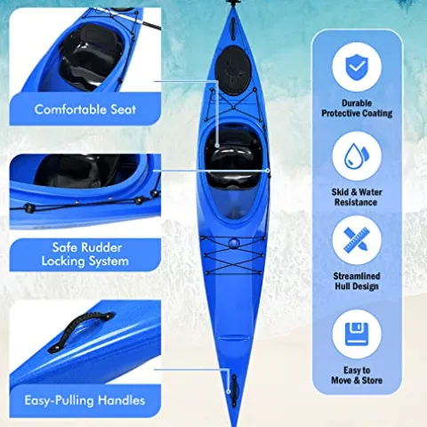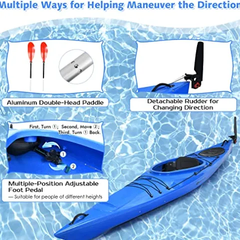 - Adjustable Foot Pedal & Removable Rudder: The sit-in kayak contains a flexible foot pedal that can be adjusted at different positions, so people of different heights could find the comfiest position. Plus, the recreational kayak has a locking system to adjust the rudder, which is detachable and effective to change heading directions.