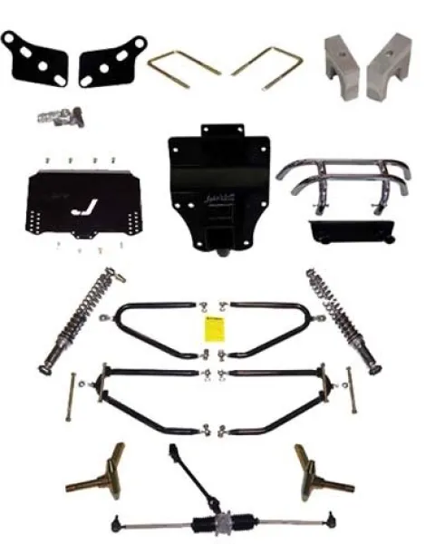Upgrade your Club Car DS Golf Cart with the 6″-10″ Jakes Long Travel Lift Kit from Golf Cart King. This kit features independent front suspension for a smooth and adjustable ride, along with heavy-duty components like DOM tubing and a synchronized steering box for durability. With a built-in 2″ receiver hitch, this lift kit is perfect for enhancing your golf cart’s performance on the course or off-road. Please note that this kit requires silver/metal dust covers and is not compatible with stock wheels and tires. Easy to install with everything included, this lift kit fits Club Car DS models from 1981-2004.5 Electric and 1996.5-2004.5 Gas with metal dust covers on the front hubs.