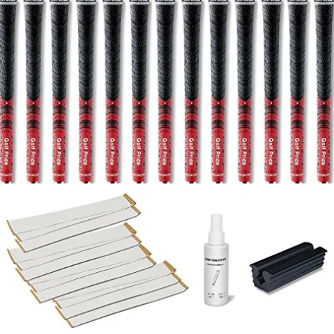 Enhance your golf game with the Golf Pride New Decade MCC 0.600 Grip Kit in striking Red. This comprehensive kit includes 13 grips, 13 strips of 2-inch double-sided grip tape, a 4 oz. bottle of grip solvent, and a rubber vise clamp, providing everything you need for easy grip replacement. Elevate your performance on the course with the trusted quality and durability of Golf Pride grips, ensuring a comfortable and secure hold swing after swing.