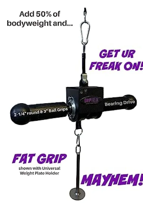 Enhance your grip strength with the Grip Freak Thick Grip Wrist Roller. This innovative tool features a patented Hanging Wrist Roller that precisely targets grip muscles, while the Cable Suspension System eliminates strain on your shoulders for effective training. The 2″ thick grips with round ball ends help build serious grip torque, and it conveniently fits all Power Racks with 1-1/4″ holes, accommodating both Standard and Olympic Weight Plates. Made in the USA with commercial-grade quality and a lifetime replacement warranty, this wrist roller is a top choice for anyone looking to improve their grip strength and forearm muscles.