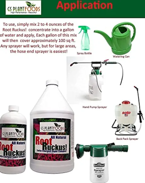 - EASY TO APPLY FOR NATURAL GREAT RESULTS: GS Plant Foods Root Ruckus is easier to apply. Simply dilute the concentrate following the instructions & pour it/spray it over your plants. For trees, shrubs, flowering plants, & vegetables dilute 3 ounces of Root Ruckus into 1 gallon of water for foliar spray (preferred). If applied directly to the soil, increase the ratio to 4oz of concentrate to 1 gallon of water. For hydroponic uses, use a ratio of 1oz concentrate per gallon of water.