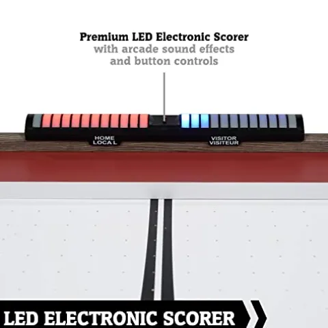 - ARCADE-STYLE GAME: The LED electronic scorer with sound effects and push button control is battery-powered (3 AAA not included) and lights up when triggered by the puck catcher sensor. The game surface easily converts to ping pong for even more fun