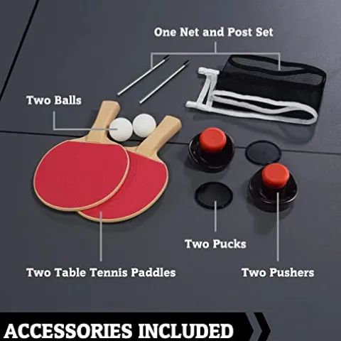 - ACCESSORIES INCLUDED: The 2-in-1 electric air-powered hockey table comes with the following accessories; 2 pucks; 2 pushers; 2-part table tennis surface; net and post set; 2 paddles; and 2 ping pong balls to start playing table hockey or tennis right away