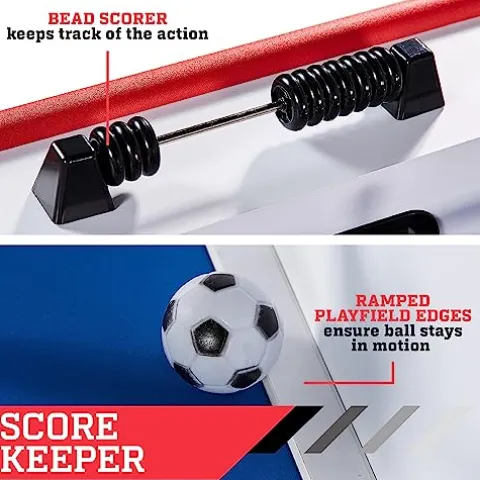 - CRAFTMANSHIP: The foosball table has a scratch-resistant two-toned PVC laminated finish over MDF. Goal boxes return your tabletop soccer ball after each goal, and a traditional bead-style slide scorer tracks the action.