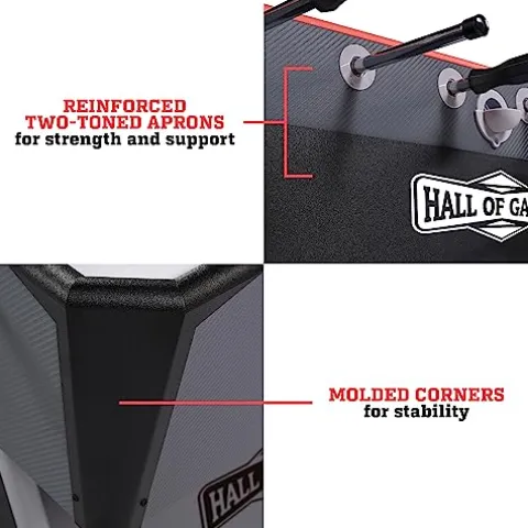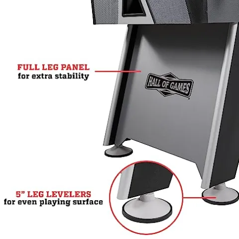 Experience intense and competitive foosball matches with the Hall of Games 56” Arcade Foosball Gaming Table Competition Size in Black/Grey. This arcade-style table features a 46.75″ x 26.375″ playfield and durable construction, perfect for family game rooms. The 5/8” steel rods with non-slip handles ensure smooth gameplay, while the PVC laminated MDF playfield keeps the action fast-paced. With goal boxes, slide scorers, and sturdy MDF legs with adjustable levelers, this foosball table offers both style and functionality. Easy assembly and a recommended game room size of 9’ x 8’ make it ideal for hours of fun with family and friends.
