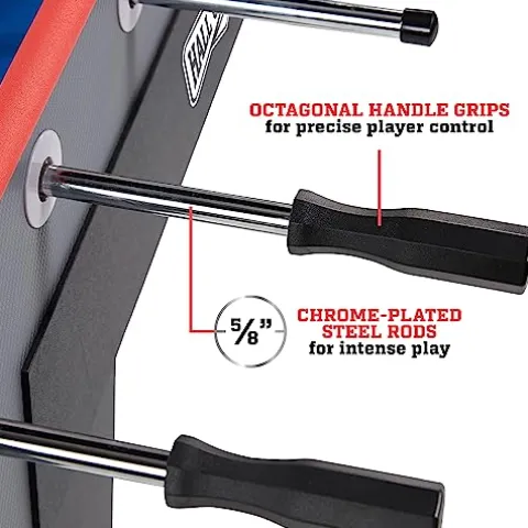 - INTENSE GAME PLAY: The 5/8” steel rods on this foosball table glide over plastic bearings and have a hollow design and non-slip octagonal handles for ball control. Sideline ramps keep the ball moving on the PVC laminated, 12mm MDF playfield.