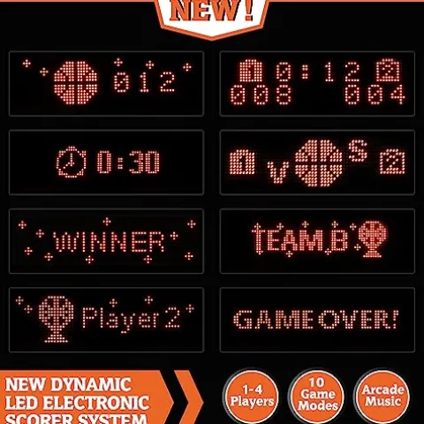 - ARCADE-STYLE GAME ACTION: The dynamic LED scoreboard with a plug-in power adaptor can display scores for 1 to 4 players and 10 different game modes with arcade sounds that can be switched on or off while playing, baskets are tracked with paddle sensors.