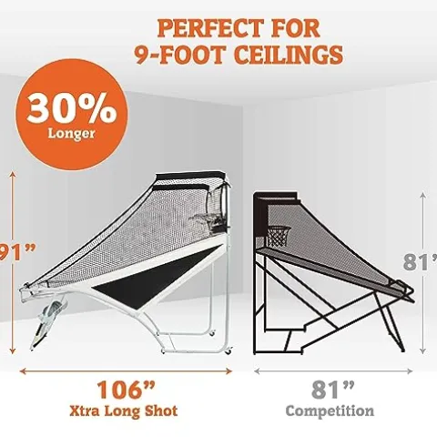 - EXTRA LONG SHOTS: This 106” long arcade basketball game delivers classic indoor action with the added fun of taking 30% longer shots at the hoops, compared to regular-length games, with the same great EZ-Fold storage design that helps save space.