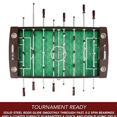 - FUN FOR THE WHOLE FAMILY – Enjoy classic foosball in a contemporary finish with this premium foosball table from Hathaway. Both kids and adults will love its ABS counterbalanced players, slick surface and grassy, soccer-like style.