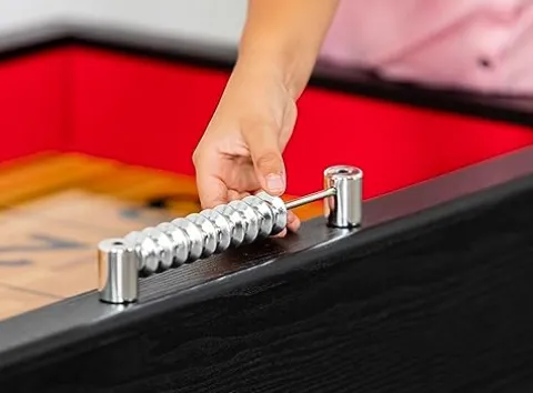 - ALL THE ACCESSORIES YOU NEED – Start playing the day it arrives. Includes 4 blue pucks, 4 red pucks, a table brush and shuffleboard wax