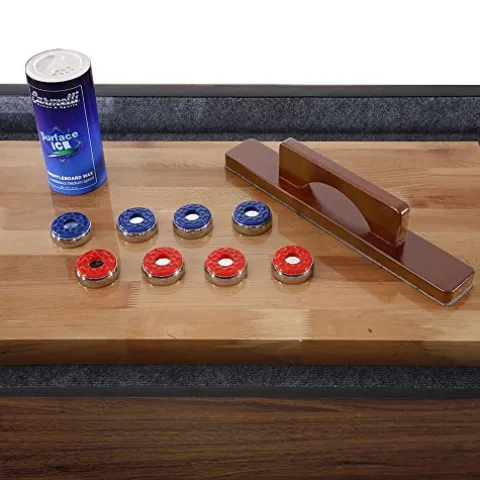 The Hathaway Challenger Shuffleboard Table in Walnut Finish offers a professional-grade playing experience with its hardwood butcher block playfield coated in a smooth polyurethane surface, ensuring highly accurate gameplay. This stylish table features built-in storage cabinets within its pedestal-style legs, complete with antique bronze hinges and a walnut laminate for a classic look. With independent leg levelers for stability, integrated climate adjusters for optimal performance, and a 180-day warranty guaranteeing its quality, this shuffleboard table is a perfect addition to any game room. Dimensions include 168.5 inches in length, 24.25 inches in width, and 30.5 inches in height, with a playing surface of 158 inches in length, 15 inches in width, and 1.5 inches in height.