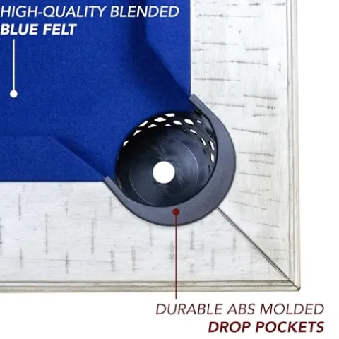 Enhance your game room or living space with the Montecito 8-ft Pool Table in a sleek Driftwood finish with Blue Felt by Hathaway. Combining contemporary style with classic charm, this table features inlaid sights that add a touch of luxury. The 1.75-inch thick engineered wood playfield ensures smooth and rapid ball action, rivaling slate surfaces. Designed for premium play, the K-66 gum-rubber cushions deliver clean and accurate ball rebounds. Ideal for families, this high-quality table is perfect for adults and kids alike. With dimensions of 96 inches in length, 55.5 inches in width, and 32.5 inches in height, this table is a stylish and sophisticated addition to any space. Plus, enjoy peace of mind with a 180-day manufacturer warranty ensuring that your product arrives damage-free with all necessary parts and accessories.