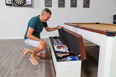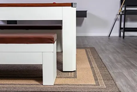 - BUILT-IN STORAGE – Two benches with soft, padded seats provide a convenient place to sit while eating or playing and slide under the table when not in use. Each seat lifts to reveal internal storage, allowing you to easily store your pool and table tennis accessories.