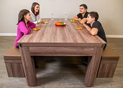 - TAKE A BREAK – Two benches with soft, padded seats provide a convenient way to relax. Each seat lifts up to reveal internal storage, allowing you to easily store your pool and table tennis accessories.