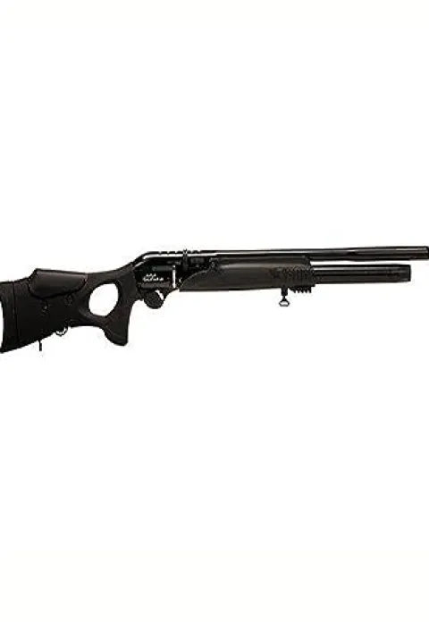 The Hatsan Galatian III QE PCP Air Rifle in .177 caliber combines precision and performance for both novice and experienced shooters. This sleek black air rifle features a repeating side-lever mechanism and is equipped with QuietEnergy technology, ensuring a quieter shooting experience thanks to its integrated sound moderator. The Quattro Trigger offers a fully adjustable two-stage match trigger for enhanced accuracy. With a detachable 255cc air cylinder capable of reaching 2,900 psi, you can enjoy extended shooting sessions, and the included hard case and two magazines provide added convenience. Achieve impressive velocities of up to 1300 FPS with lead-free pellets and 1150 FPS with lead pellets, delivering a maximum muzzle energy of 28 FPE. Experience the elevated performance and reliability of the Hatsan Galatian III, designed for serious airgun enthusiasts.
