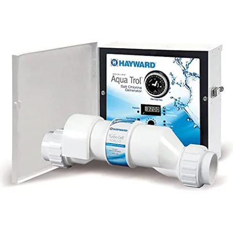 Keep your above-ground pool clean and sanitized effortlessly with the Hayward W3AQ-TROL-RJ-TL AquaTrol Salt Chlorination System. Designed for pools up to 18,000 gallons, this system includes the Hayward TurboCell Salt Chlorination Cell (T-CELL-5), return jet fittings, twist lock line cord, and outlet. Say goodbye to handling chlorine manually – this system automatically converts salt into chlorine for continuous sanitization, providing luxuriously soft water that is gentler on the eyes and won’t dry out skin and hair. Enjoy the benefits of silky smooth water that won’t fade fabrics, making maintenance a breeze.