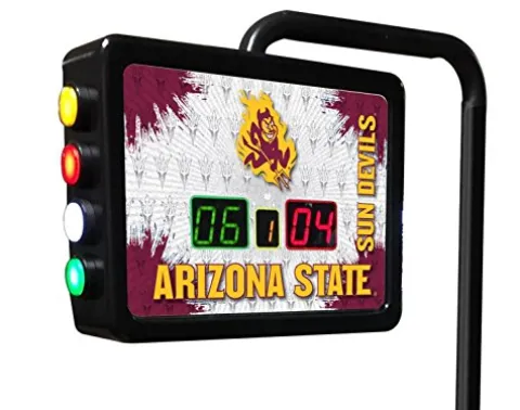 Enhance your shuffleboard game with the Holland Bar Stool Co. Arizona State Electronic Shuffleboard Scoring Unit. This officially licensed unit features the iconic Sparky logo with digitally printed full-color graphics, adding a touch of team spirit to your game room. The color-coded push-button counter allows for easy tracking of 2 player scoring and overall game count. Measuring at 15″ (W) x 11 1/2″ (H) x 3 1/2″ (D), this scoring unit is compact yet effective. The included support extends the unit over the playfield, standing at 51″ tall. Versatile and adaptable, it can be mounted on almost any game with the supplied shims, making it a convenient addition to your gaming setup.