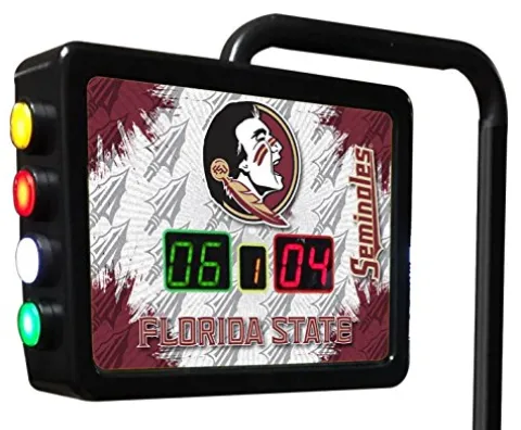 Enhance your shuffleboard experience with the Holland Bar Stool Co. Florida State (Head) Electronic Shuffleboard Scoring Unit. This officially licensed unit features vibrant, digitally printed graphics that showcase your team spirit. The color-coded, push-button counter simplifies 2-player scoring and game tracking, ensuring a seamless match every time. Measuring 15″ wide and 11.5″ high, the scoring unit is supported by a sturdy 51″ tall stand, extending approximately a foot over the playfield for optimal visibility. Designed for versatility, it easily mounts to nearly any game setup with an included mounting plate and shims. Elevate your game with precision and style, making every point count with this reliable and eye-catching scoring system.