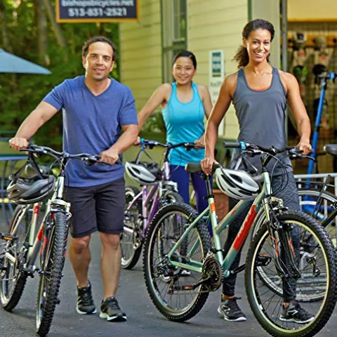 The Huffy Escalate Hardtail Mountain Trail Bike is a top choice for adventure seekers. Featuring a lightweight aluminum hardtail frame with a 10-year warranty, this bike offers durability and speed. With a 21-speed Shimano drivetrain for smooth shifting, front suspension for varied terrains, and alloy linear pull brakes for reliable stopping power, this bike is designed for optimal performance. The 26″ wheel/18″ frame size in gloss nickel is ideal for riders with a minimum inseam of 32 inches. Whether you’re cruising on gravel paths or tackling wet conditions, this bike delivers comfort and control for an exhilarating ride.