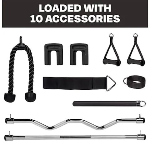 - INCLUDED ACCESSORIES: 3 Month Subscription to Centr’s digital platform, Tricep Rope, 2 Rubber D Handles, Dual Hook Straight Bar, EZ Curl Bar, Ankle Strap, Multi-function Belt, Sport Handle, 5 lb Add-On Weights (2), 2 Water Bottles, and Exercise Booklet