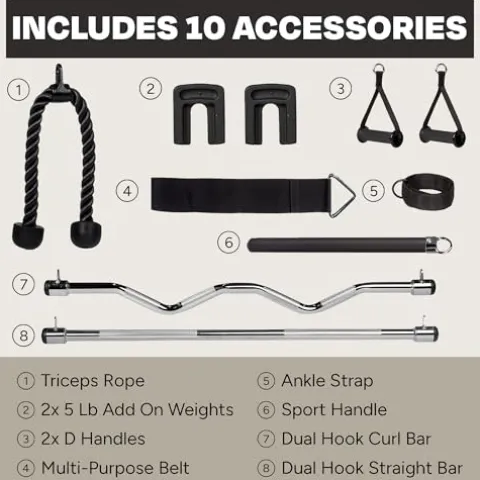- OVER 10 ACCESSORIES INCLUDED: Tricep Rope, 2 Rubber D Handles, Dual Hook Straight Bar, EZ Curl Bar, Ankle Strap, Multi-function Belt, Sport Handle, 5 lbs Add-On Weights (2), 2 Water Bottles, and Exercise Booklet