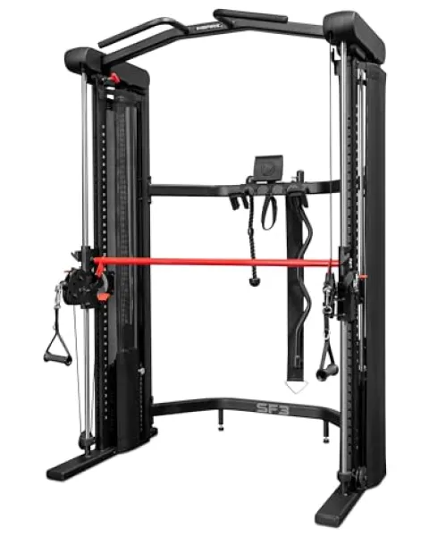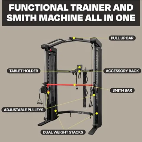 Enhance your home gym setup with the Inspire Fitness Home Gym Functional Trainer featuring the patented Smith Bar & Weight Multiplier System, providing up to 330 lb of resistance without the need for a spotter or Olympic weight plates. This compact workout machine boasts premium detail and design with frictionless movement and an industrial-grade steel construction. Loaded with extras like a built-in pull-up bar, accessory storage, and a tablet holder, it also includes dual-weight stacks of up to 165 lb and 7 accessories to keep your workouts versatile. Elevate your fitness routine with this all-in-one home gym solution.