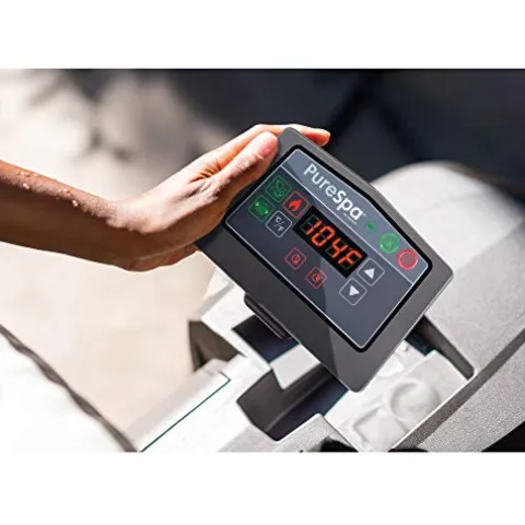 Transform your backyard into a personal retreat with the Intex Greywood Deluxe 4 Person Inflatable Portable Heated Bubble Hot Tub Jet Spa, Grey, bundled with the Round PureSpa Energy Efficient Spa Hot Tub Cover. This luxurious spa features a wireless touch button control panel, offering up to 48 hours of operation on a full charge for ultimate convenience. Experience unparalleled relaxation with over 140 high-powered massaging bubble jets and two premium foam headrests. Enhance your spa experience with a multi-colored LED light, perfect for setting the mood. The durable cover ensures your hot tub stays warm between uses, maximizing energy efficiency and saving you money. This bundle is ideal for those in California, as it includes the required energy-efficient cover, ensuring compliance with local shipping regulations. Elevate your relaxation with this premium spa experience.