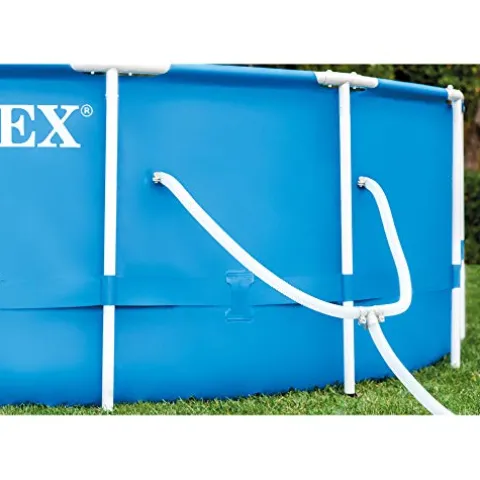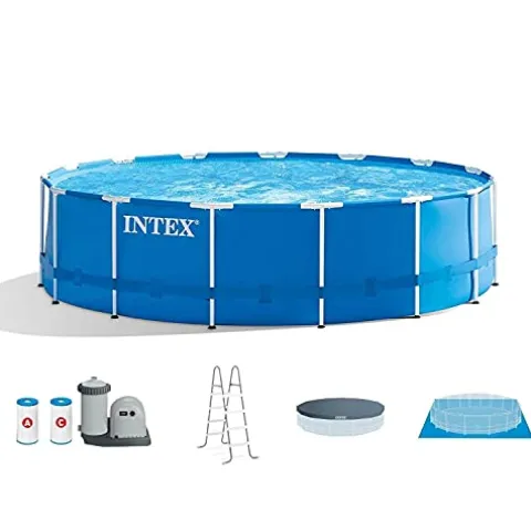 Dive into endless summer fun with the INTEX 28253EH Metal Frame Above Ground Swimming Pool Set. This robust 18ft x 48in pool is crafted with super-tough, puncture-resistant 3-Ply PVC material, ensuring durability throughout the season. Its innovative HydroAeration Technology enhances water clarity and freshness, while the 1500 GPH Krystal Clear Filter Pump with automatic daily filtration keeps maintenance effortless. Assembly is a breeze thanks to the pinless, rust-resistant T-joints, getting you ready for a splash in just 60 minutes. Complete with a removable ladder, pool cover, and ground cloth, this pool offers ample space for family fun, holding up to 6,423 gallons of water. Embrace a new level of backyard enjoyment with this comprehensive swimming pool set from Intex.